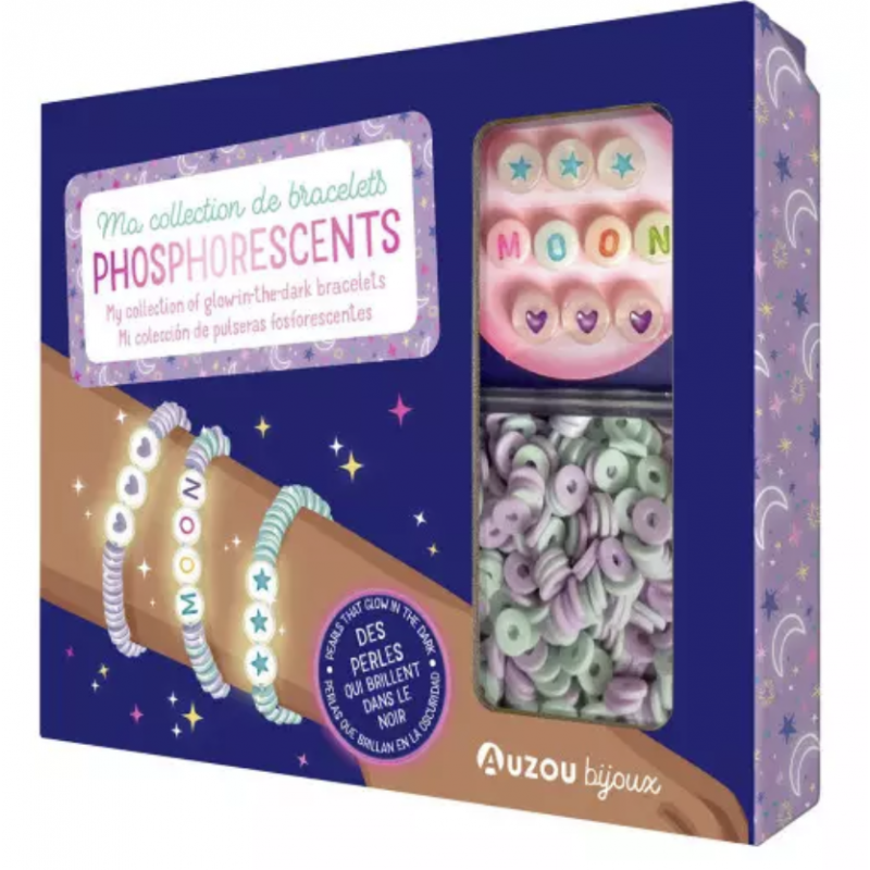 La boîte comprend un livret de pas à pas et tout le matériel nécessaire pour réaliser tes bracelets : des perles phosphorescentes avec des lettres et des motifs, des perles heishis et du fil élastique coloré.