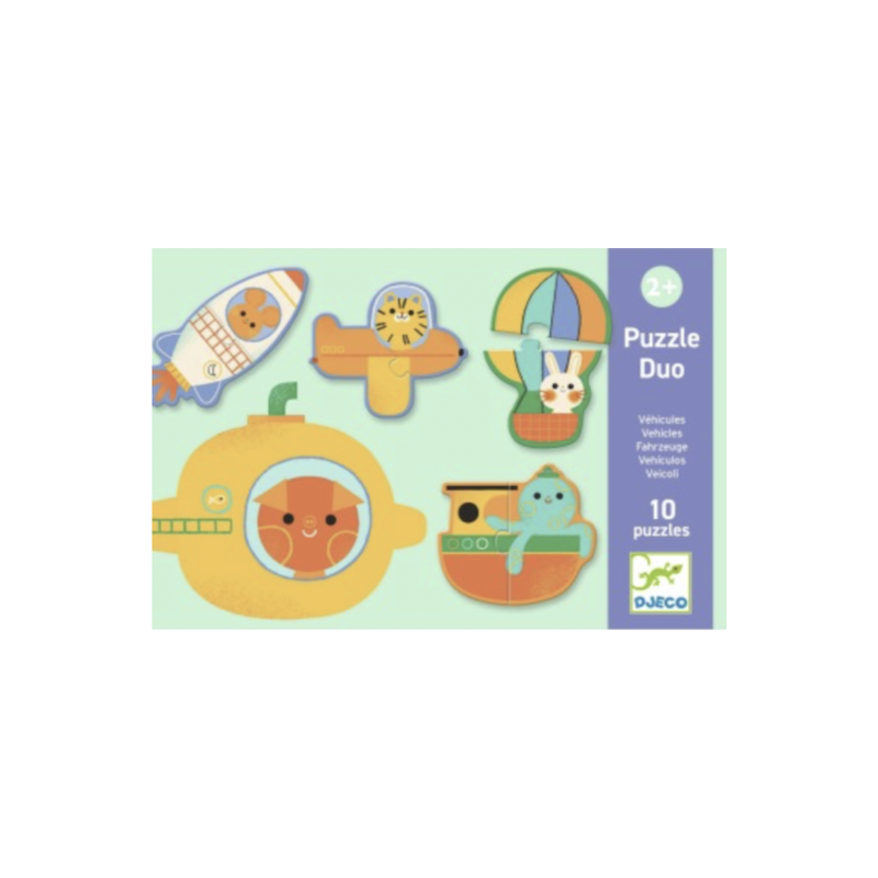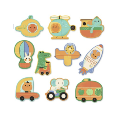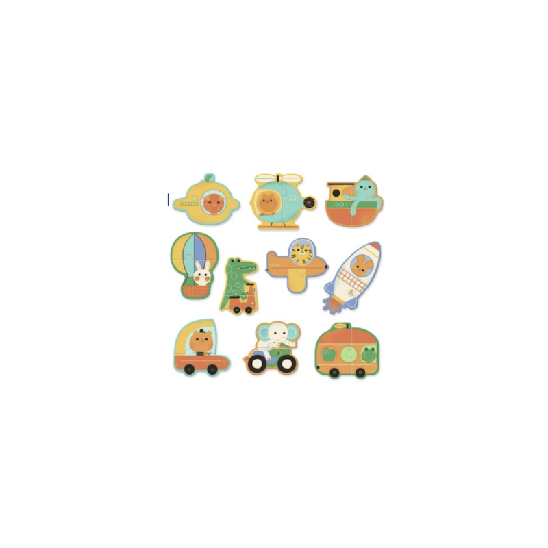 Fusée, caravane, avion, montgolfière, sous marin ou hélicoptère, votre tout petit s'amusera à reconstituer les puzzles pour reconnaitre ses véhicules préférés et les animaux qui les conduisent ou pilotent.
