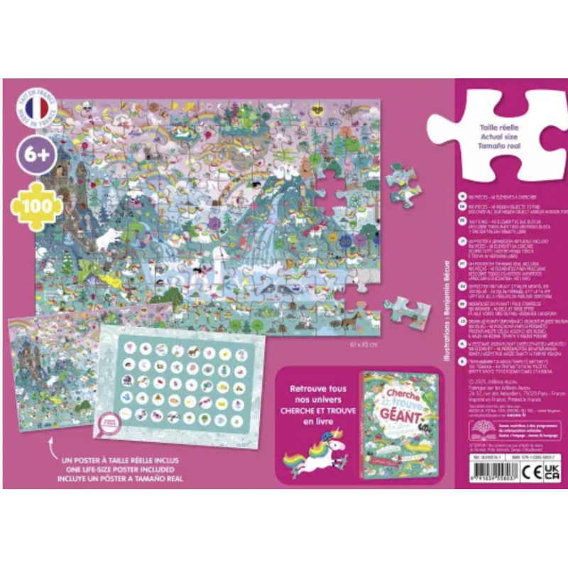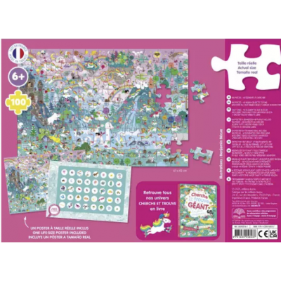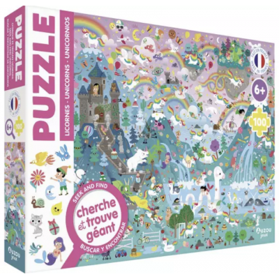 Un magnifique puzzle cherche et trouve chez les licornes ! Puzzle à partir de 6 ans, fabriqué en France. Le puzzle cherche et trouve est une déclinaison de notre collection de cherche et trouve. Avec un poster : au recto, la belle illustration ; au verso, les éléments à cherche et retrouver dans le puzzle ! Age : 6 ans 100 pièces Format puzzle : 61 x 42 cm Thème : les licornes