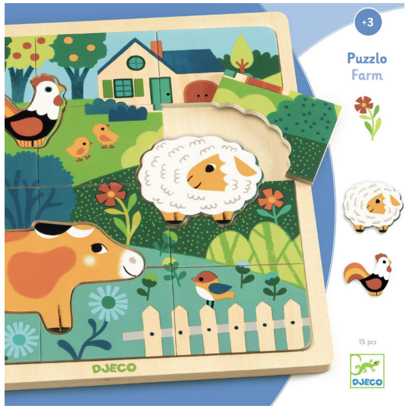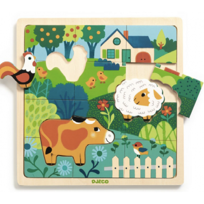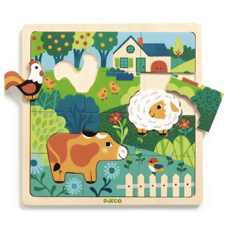 Dans un cadre en bois, l'enfant reconstitue une belle image composée de 12 pièces et découvre 3 animaux de la ferme: le coq, le mouton et la vache.