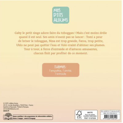 Lulu le petit singe adore faire du toboggan ! Mais c'est moins drôle quand il est seul. Ses amis n'osent pas se lancer : éléphant a peur de briser le toboggan, girafe est trop grande, fourmi, trop petite, poisson ne peut pas quitter l'eau et oiseau craint d'abîmer ses plumes. Tour à tour, à force d'entraide et d'astuces amusantes, chacun finit par profiter de ce moment.
