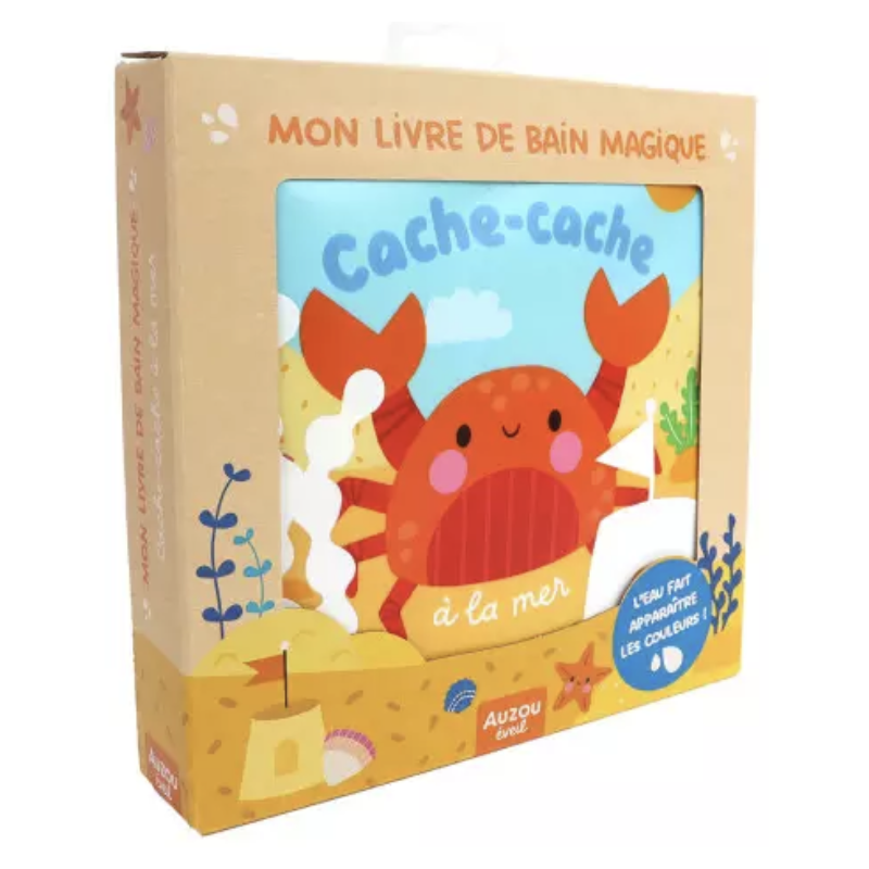 Suivez le petit crabe qui joue à cache-cache à la mer ! Sur chaque page, l'enfant interagit avec l'histoire : en plongeant son livre dans l'eau, des zones blanches (de peinture magique) disparaissent et découvrent des éléments cachés !