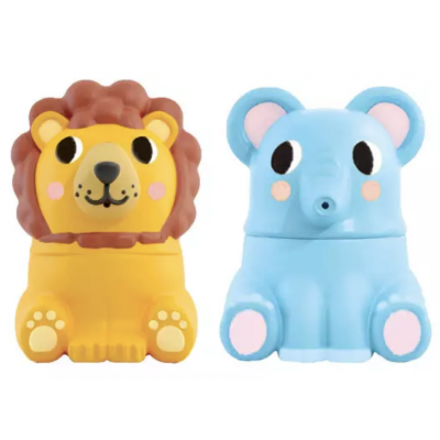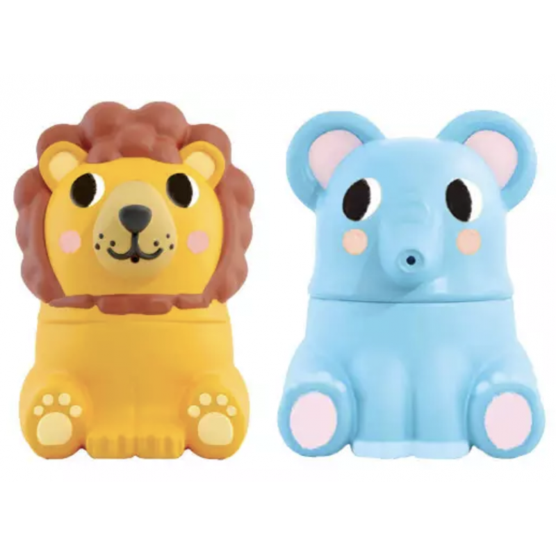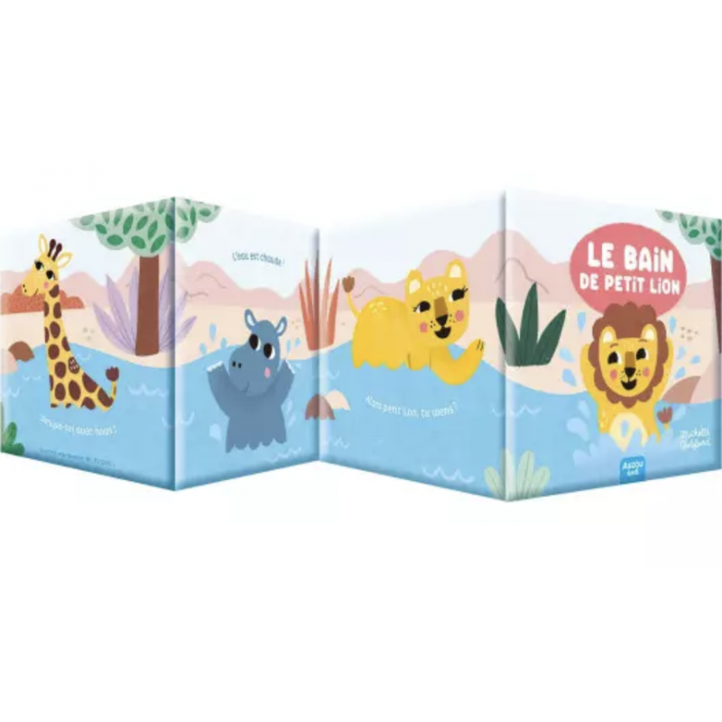 Ce coffret de bain comporte 1 livre de bain accordéon pour découvrir les animaux de la savane, et 2 jouets de bain cracheurs offerts, en matière recyclée et éco-responsable.