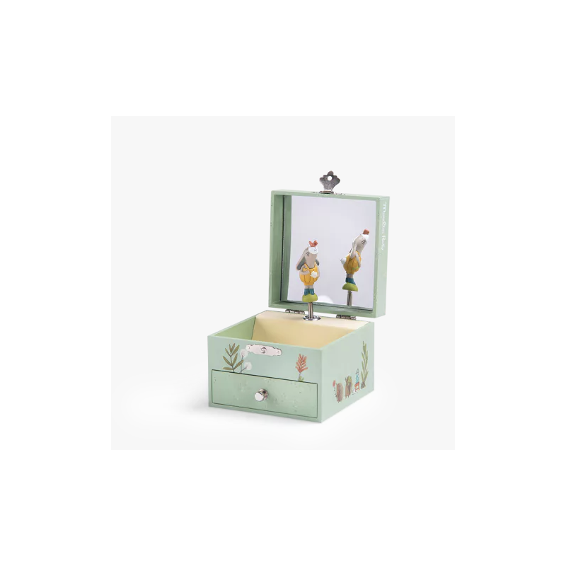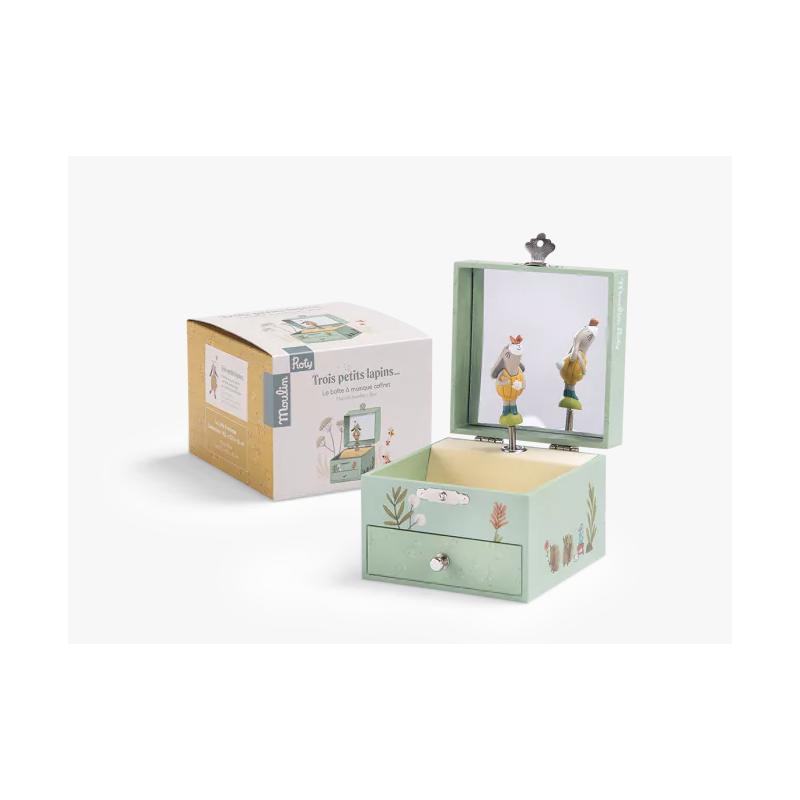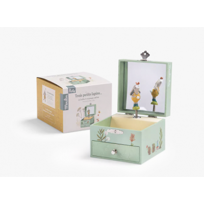 Boîte à musique coffret de la collection Trois petits lapins. Ouvre la boîte et regarde tourner, sur une douce mélodie, le lapin avec son ami le papillon délicatement posé sur le bout de son nez. Un petit tiroir permet de ranger ses précieux secrets…