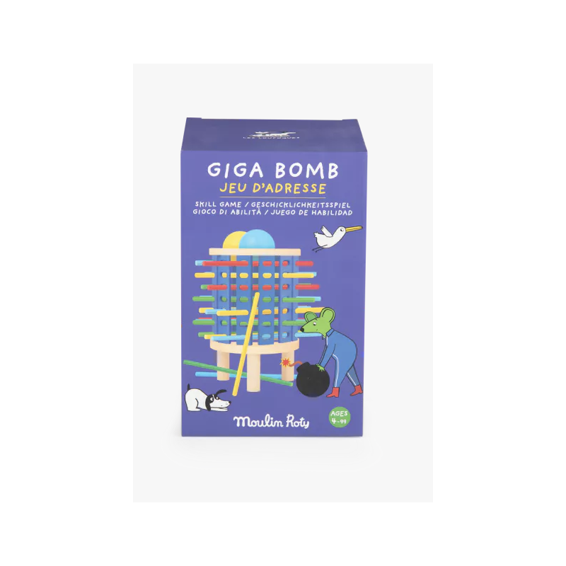 Boum ! En compétition ou en coopération, tous ensemble contre la Giga Bombe ! Le but du jeu est de conserver sa boule dans la tour le plus longtemps possible sans faire tomber la Giga Bombe en bois. Se joue entre 2 et 3 joueurs, à partir de 4 ans.