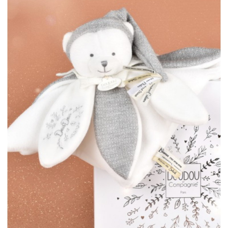 Offrez à Bébé un écrin de douceur avec ce magnifique doudou plat, spécialement créé pour célébrer nos 25 ans. Son tissu en tweed gris, d'une douceur incomparable, et ses broderies délicates en font un compagnon précieux, dès les premiers instants.