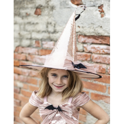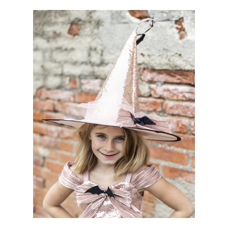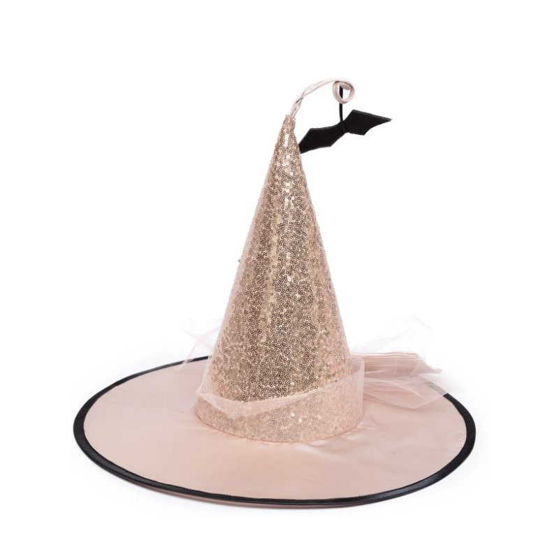 Préparez-vous à jeter un sort de glamour avec notre superbe chapeau de sorcière Glam ! Cet accessoire enchanteur est parfait pour ajouter une touche d'élégance à votre ensemble de sorcière. Fabriqué en tissu brillant en or rose, ce chapeau respire l'élégance et le glamour. Les embellissements de chauves-souris ajoutent une touche fantaisiste, ce qui en fait une pièce qui se démarque. Que vous assistiez à une fête d'Halloween ou que vous souhaitiez simplement embrasser votre sorcière intérieure, notre chapeau de sorcière Glam est l'accessoire indispensable pour toute occasion magique. Alors prenez votre manche à balai et préparez-vous à ensorceler tout le monde avec votre style impeccable !