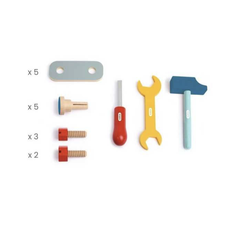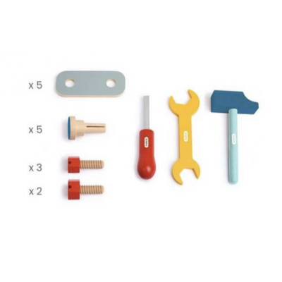Un établi compact livré avec 18 outils en bois, parfait pour les petits bricoleurs en herbe. Chaque outil est parfaitement dimensionné pour s'adapter aux petites mains des enfants, facilitant ainsi leur manipulation. Ce jeu d'imitation possède également 3 petits bacs permettent de trier et ranger les accessoires.