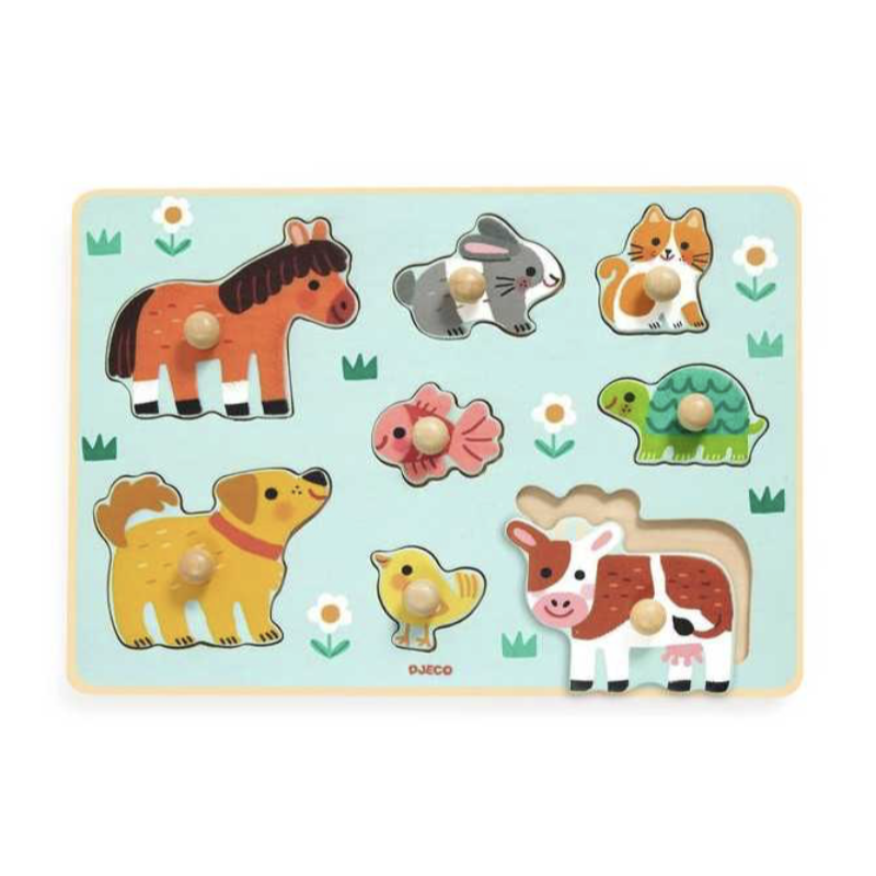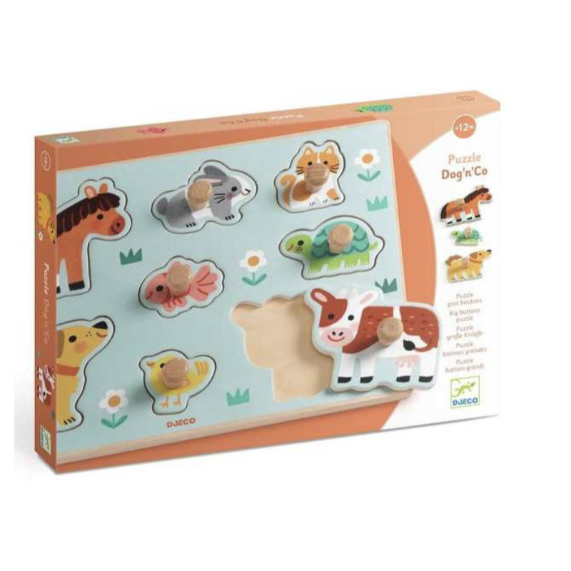Découvrez le puzzle Dog'n'Co de Djeco, un superbe puzzle en bois de 8 pièces conçu pour les enfants dès 12 mois. Un joli puzzle à encaster sur le thème des animaux avec de gros boutons en bois pour que les petites mains puissent les attraper facilement.