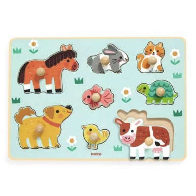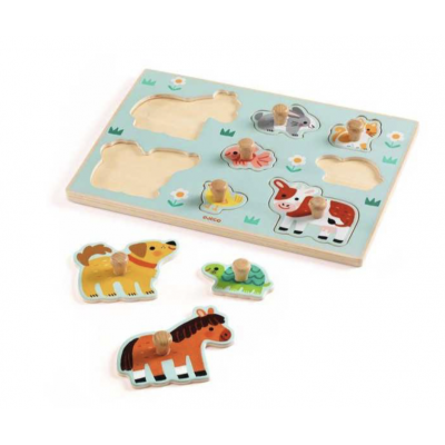 Un puzzle d'encastrement avec 8 pièces faciles à attraper et à replacer sur le socle en bois. L'enfant replace les pièces à la bonne place en observant la silhouette de l'animal : vache, tortue, cheval, lapin, poisson, chien, chat, poussin. Un jouet en bois qui permet aux enfants de développer leur dextérité, leur logique et leur imaginaire.