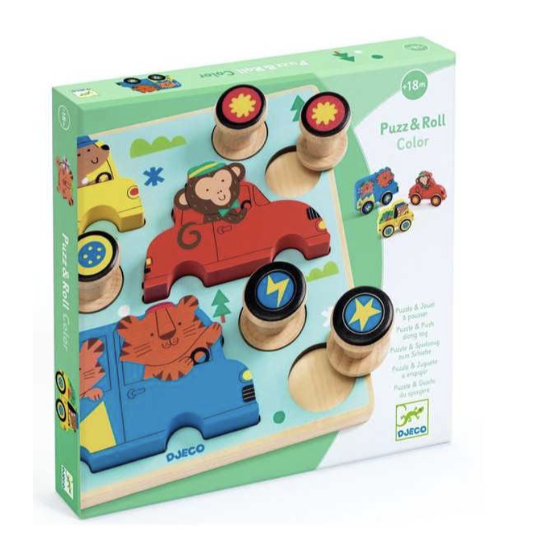Découvrez le Puzz & Roll Color de Djeco, un jouet en bois 2 en 1 conçu pour les enfants dès 18 mois : un puzzle d'encastrement et un jouet qui roule.