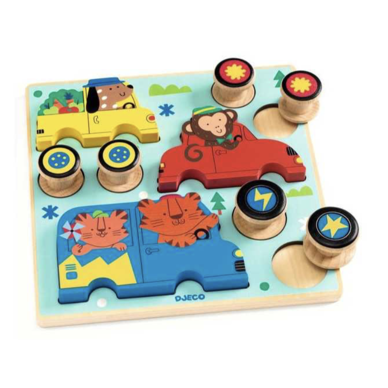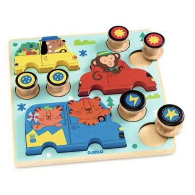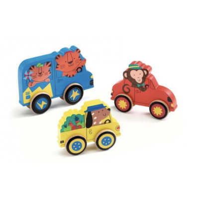 Un superbe puzzle de 9 pièces permettant de réaliser 3 véhicules qui roulent. L'enfant assemble les roues à l'animal de la même couleur et les fait rouler. Il jouera ensuite à tout replacer sur le socle, puis à recommencer!