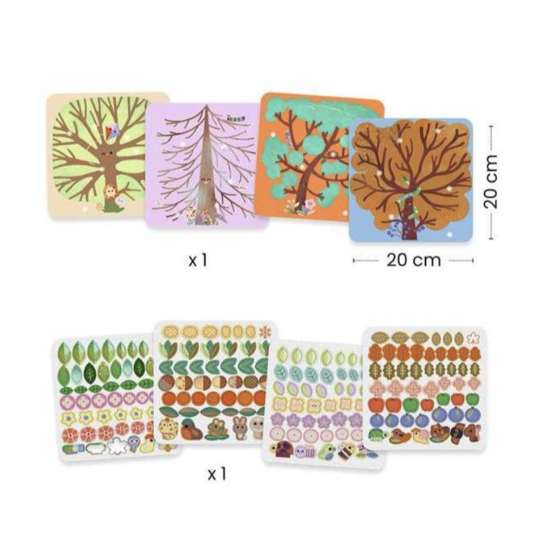 Votre enfant va s'amuser à animer les 4 tableaux représentant des arbres en collant de la douce feutrine. Les positions de départ des plus grandes pièces sont clairement indiquées, pour garantir une parfaite réussite dans le placement des autocollants sur le tableau.