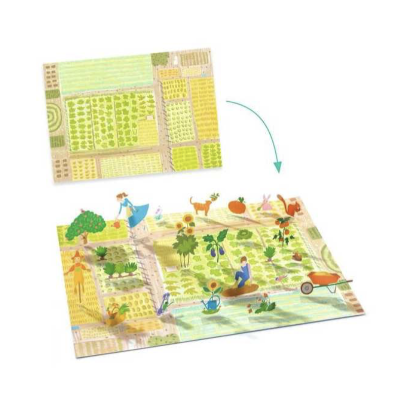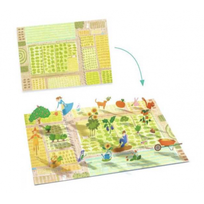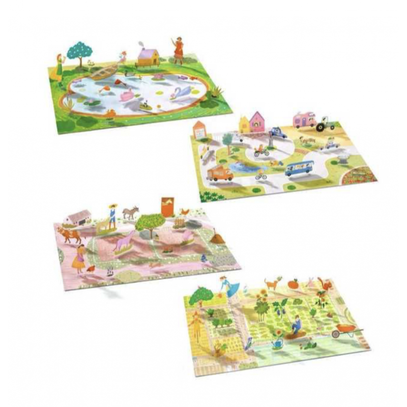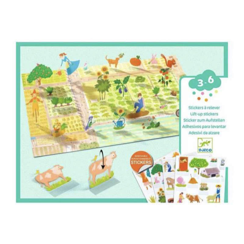 L’enfant colle les stickers sur les grandes images, puis les relève un à un… pour créer des scènes en volume, et s’inventer des histoires sur le thème de la campagne : tracteur, animaux de la ferme, jardin potager...