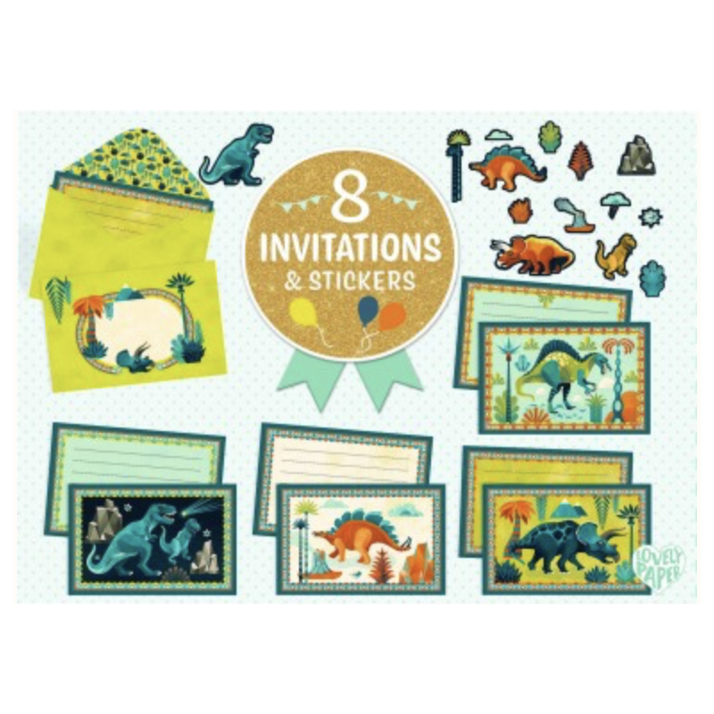 Une pochette festive pour des invitations pleines de magie ! Sur le thème des dinosaures, cet ensemble comprend 8 cartes d'invitation illustrées, 8 enveloppes assorties et 2 planches de stickers pour personnaliser chaque message. Chaque élément est sublimé par un effet métallisé et une impression mate, apportant une touche d'élégance et d’originalité.