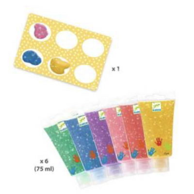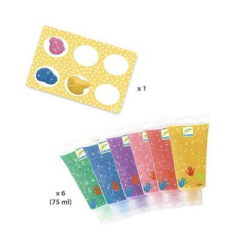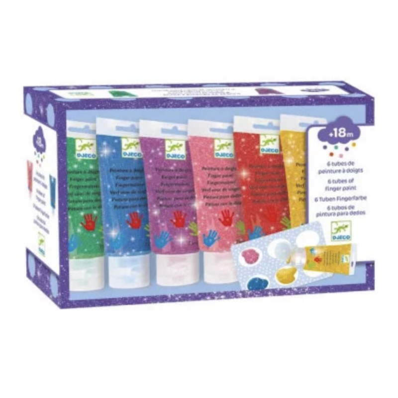 Découvrez les tubes de peinture à doigts Paillettes de Djeco, un coffret de 6 nouvelles couleurs pour peindre avec ses doigts à partir de 18 mois. Vert, bleu, violet, rose, rouge, jaune, 6 couleurs à la texture très agréable pour révéler votre petit artiste en herbe.