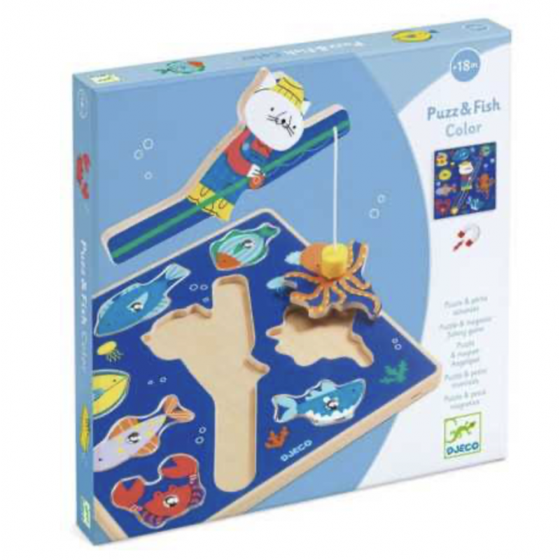 Découvrez le Puzz & Fish Color de Djeco, un jouet en bois 2 en 1 conçu pour les enfants dès 18 mois : un puzzle d'encastrement et un jeu de pêche à la ligne.