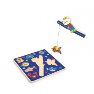 Un puzzle à encastrer avec 9 pièces sur le thème de la mer et une canne à pêche aimantée tenue par un chat. L'enfant attrape les poissons grâce au chat pêcheur, puis replace les éléments à leur place sur le socle.