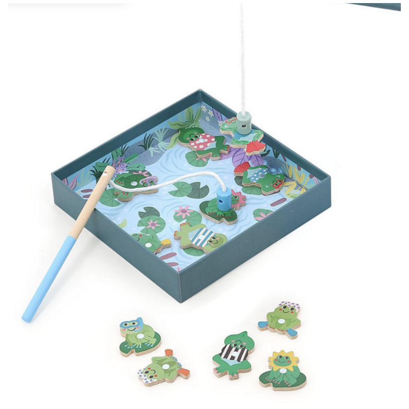 Une pêche à la ligne oui, mais pas avec des poissons, mais des grenouilles ! Craquez pour nos petites grenouilles en bois, dessinées avec malice par Michelle Carlslund. Votre enfant, muni de sa canne à pêche en bois, va devoir relever un sacré défi : attraper toutes les grenouilles ! Au total, 12 grenouilles craquantes et colorées à récupérer. Petit plus, au verso des pièces, des points sont indiqués. En jouant en duo, celui/celle qui cumule le plus de points remportera la partie.