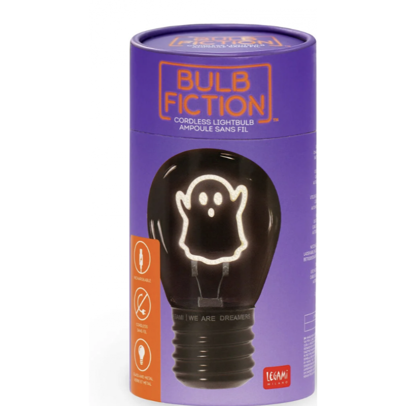 Préparez-vous à raconter vos histoires d'épouvante autour d'une lumière spectrale : la Lampe de Table en Forme d'Ampoule - Bulb Fiction - Ghost de Legami renferme à l'intérieur un petit fantôme lumineux prêt à éclairer les nuits les plus sombres. Sans fil et rechargeable, c'est le détail qui manquait à votre fête d'Halloween !