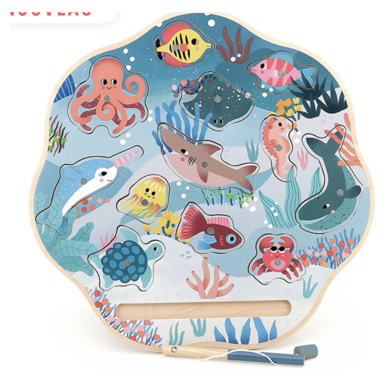 Prêt(e) pour un plongeon au fond de l’océan ? Découvrez notre pêche à la ligne en bois, décoré avec douceur par Michelle Carlslund. Votre enfant, muni de sa canne à pêche en bois, va devoir relever un sacré défi : attraper tous les animaux marins. Au cours de sa plongée, il va rencontrer une raie, une baleine, un crabe, une méduse…Au total, 12 animaux incroyables et colorés. Petit plus, au verso des animaux, les points sont indiqués. En jouant en duo, celui/celle qui cumule le plus de points remportera la partie.