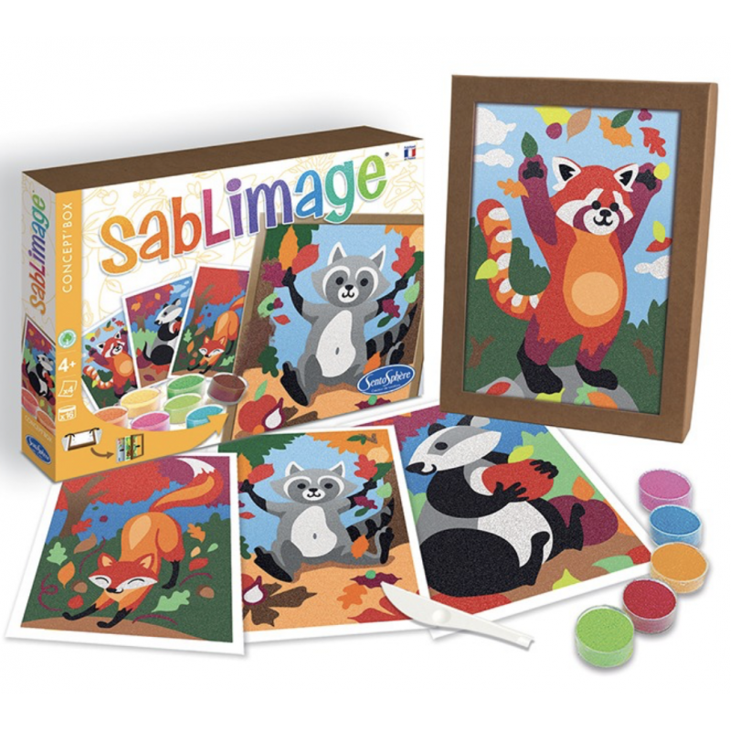 Sablimage est une gamme d’activité ludique et manuelle qui a été conçue pour que de très jeunes enfants puissent facilement, et en toute liberté, réaliser de jolis tableaux naïfs sans se salir.
