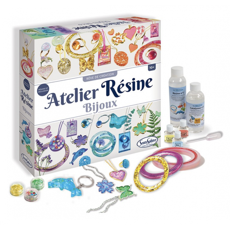 Un coffret clé en main qui permet de réaliser de merveilleux bijoux en résine avec des inclusions de paillettes, de décorations en polymère, ou même de fleurs séchées et de coquillages !
