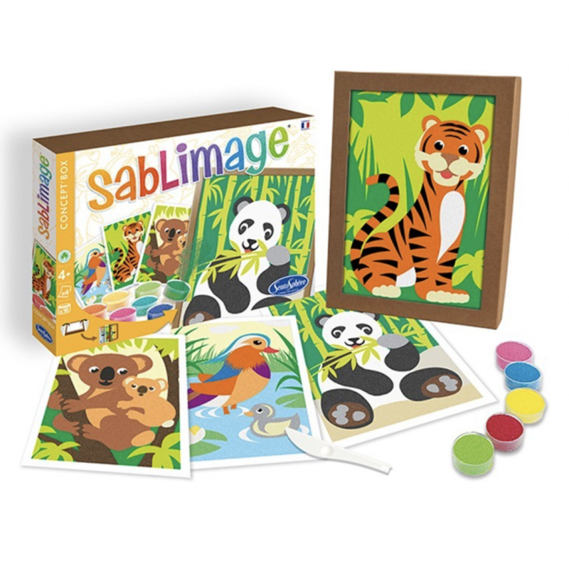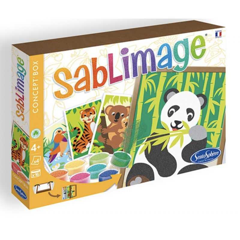 Sablimage est une gamme d’activité ludique et manuelle qui a été conçue pour que de très jeunes enfants puissent facilement, et en toute liberté, réaliser de jolis tableaux naïfs sans se salir. Il suffit de décoller les surfaces préencollées et de les saupoudrer avec les différents sables proposés. Couleur après couleur, chaque illustration prendra vie pour devenir un réel chef d’œuvre ! Un joli résultat est garanti pour les artistes de tout âge.
