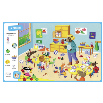Dans ce nouvel album "Cherche et trouve", l'enfant s'amuse à retrouver et à nommer les objets incontournables d'une journée à l'école.
