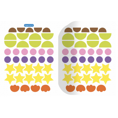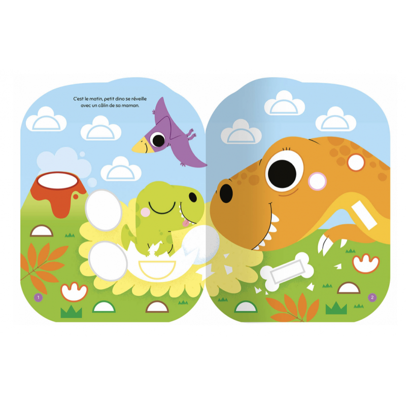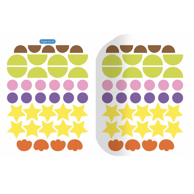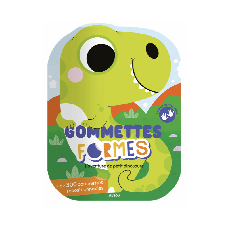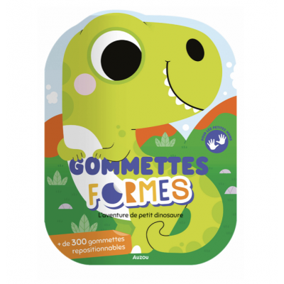 Un cahier de plus de 300 gommettes de formes géométriques, qui servent à compléter l’histoire de petit dinosaure, à travers un cahier de décors détachable.