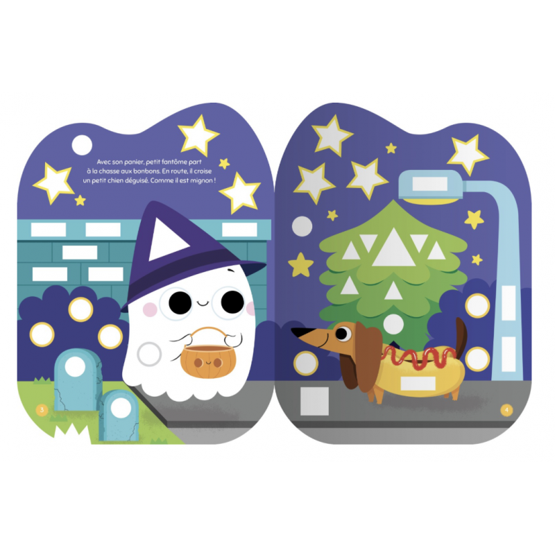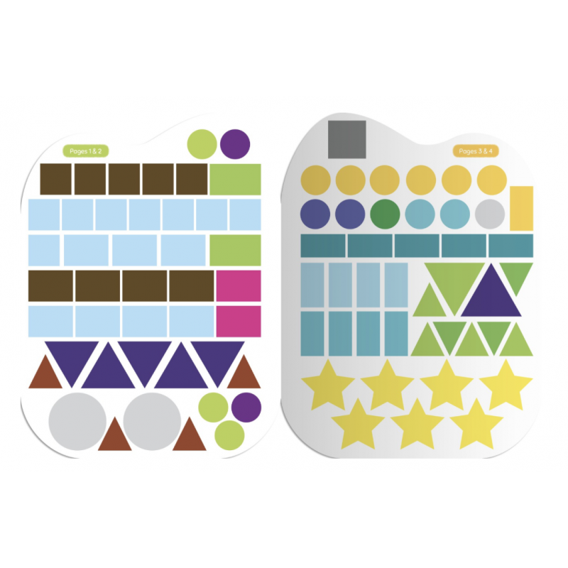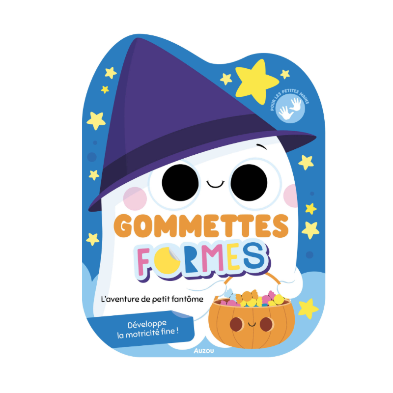 Un cahier de plus de 200 gommettes de formes géométriques, qui servent à compléter l’histoire de petit fantôme, à travers un cahier de décors détachable.