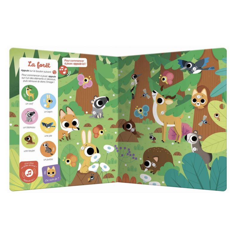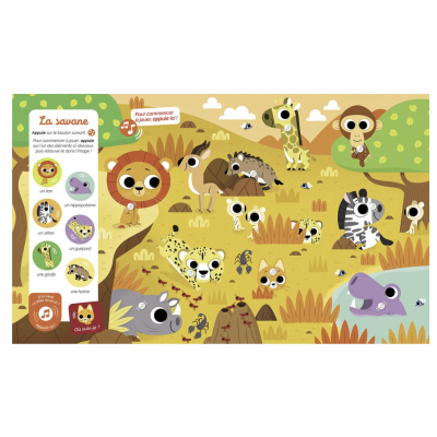 Dans ce nouveau cherche et trouve sonore, le tout-petit explore le monde des animaux à travers 12 planches foisonnantes de détails et près de 100 sons à découvrir !