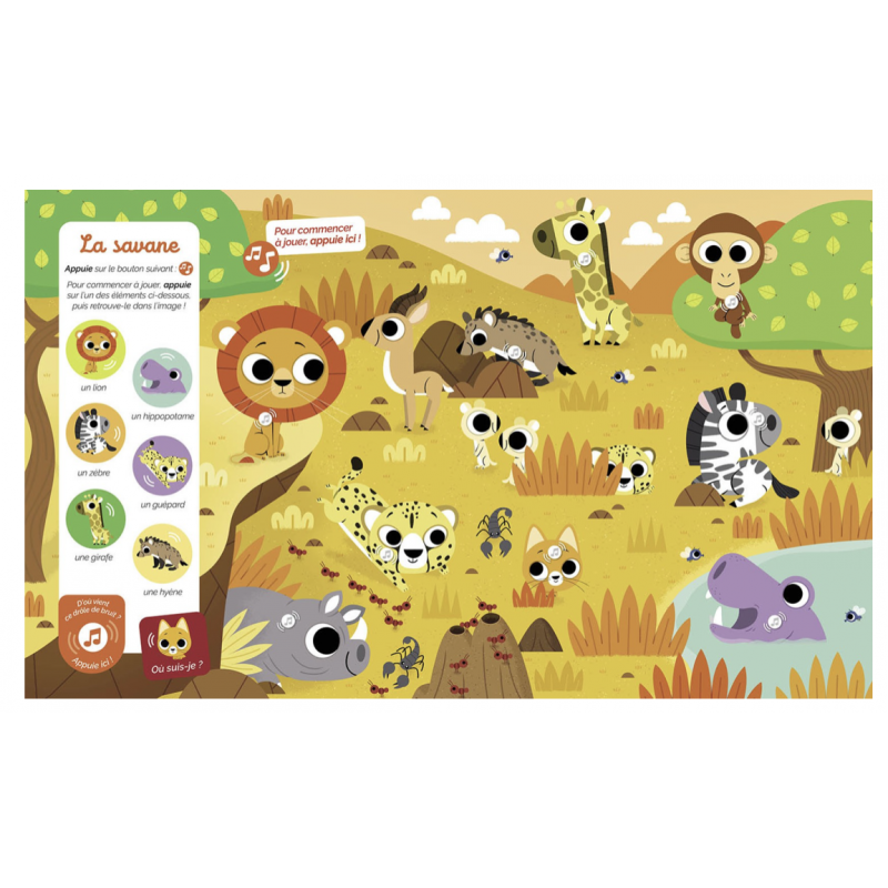 Sur chaque double-page, il observe et écoute attentivement pour retrouver 6 animaux et une mascotte qui se cache dans tous les univers : la ferme, la forêt, la savane, l'océan, la nuit...