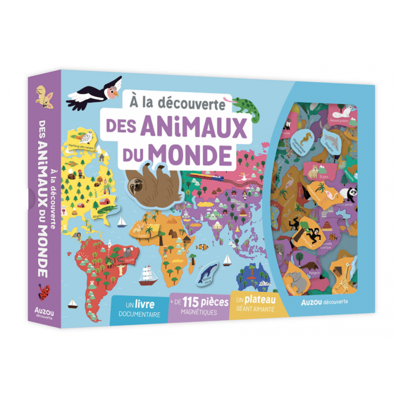 La boîte comprend un livre documentaire de 64 pages pour tout savoir sur les animaux du monde entier, classés par continents, ainsi que plus de 115 aimants à replacer sur un grand plateau aimanté.