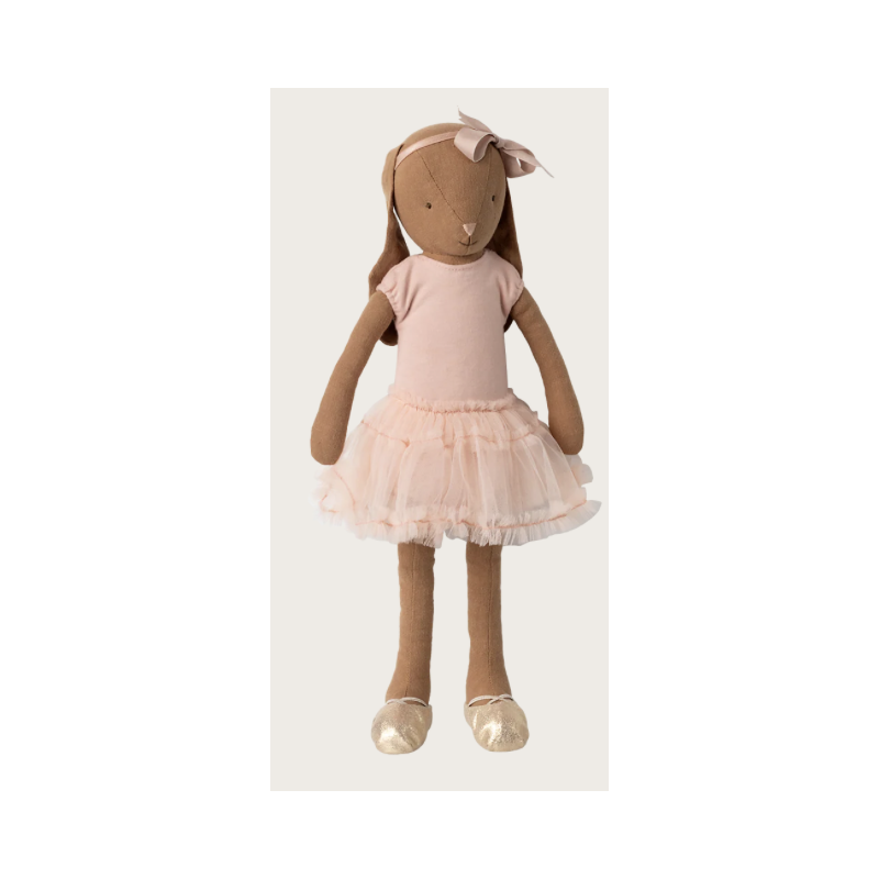 La célèbre lapine ballerine Maileg est prête pour son cours de ballet. Elle porte un body, une jupe en tulle et un joli bandeau à pompon, autour de ses oreilles basses.