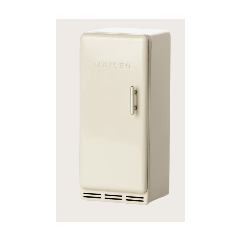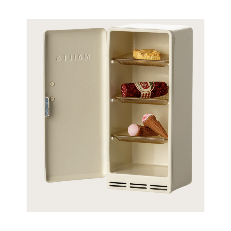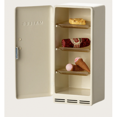 Un réfrigérateur vintage qui s'intègre parfaitement à la maison souris Farmhouse Maileg. À l'intérieur du réfrigérateur, vous trouverez un morceau de fromage, une saucisse et quelques glaces. Ceux-ci prolongeront l'histoire en cours et le jeu.