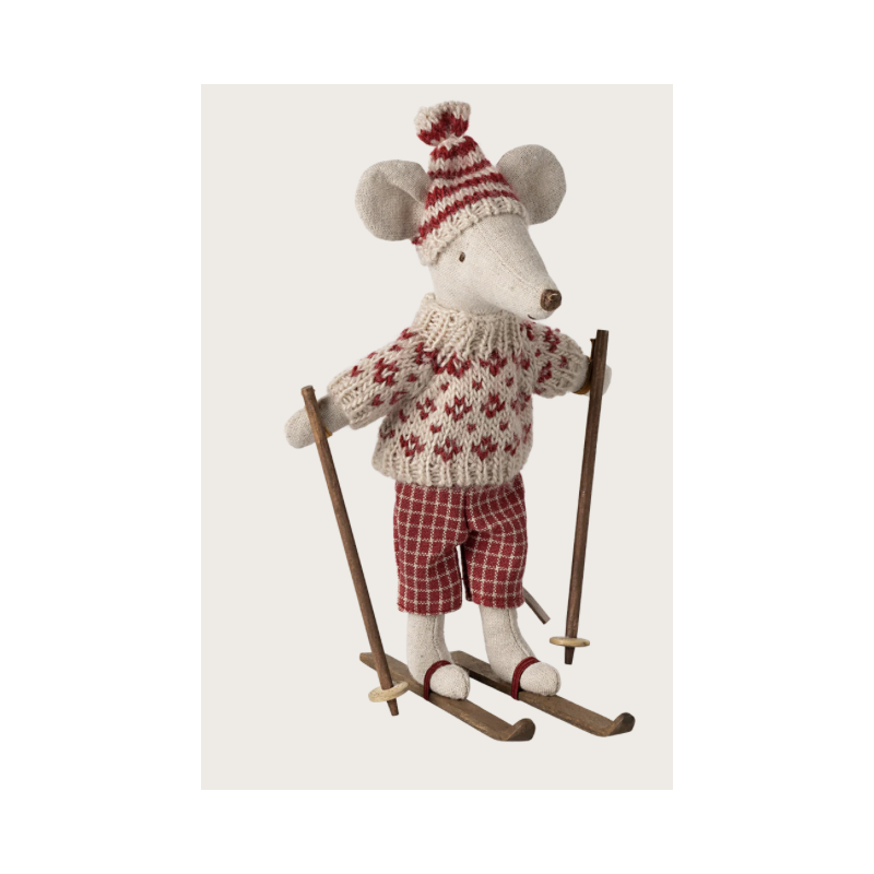 Une souris prête à s'amuser l'hiver, pendant des heures, sur les pistes enneigées. Chaque set contient une souris chaudement habillée avec une paire de skis et des bâtons; sans oublier son adorable bonnet tricoté qui gardera sa tête au chaud.