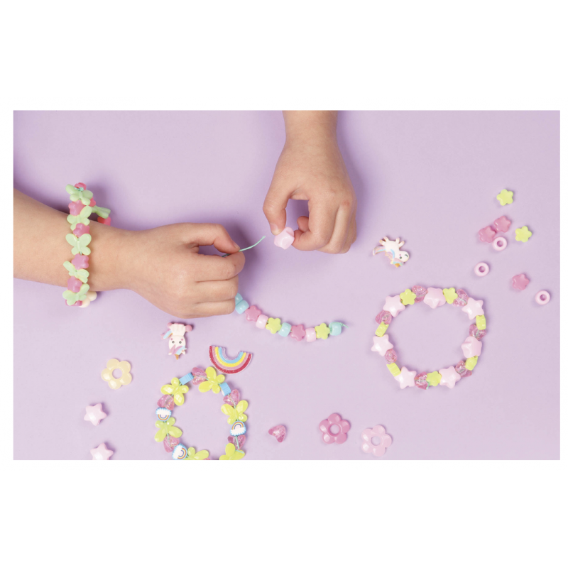 Dès 3 ans, l’enfant trouvera dans ce coffret un assortiment de perles de couleurs et de formes différentes, ainsi que des breloques fantaisie whaouh !