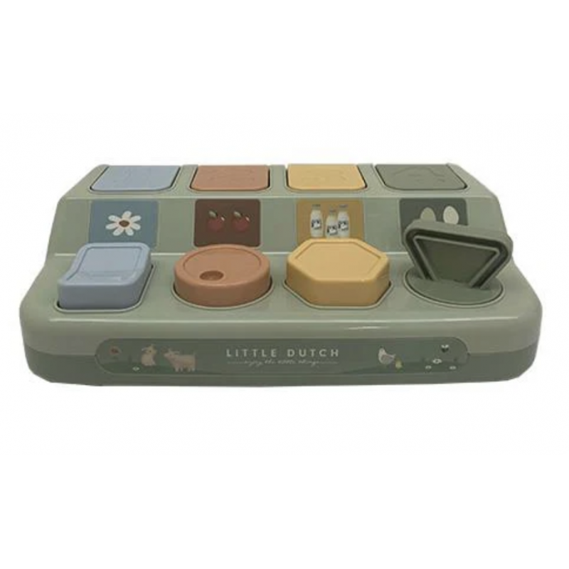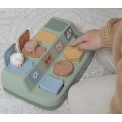 Coucou! Quel animal de la ferme apparaît lorsque tu tournes les boutons? Est-ce un mouton, un cochon, une vache ou une poule? Ce qui est amusant avec les animaux Pop-Up, c'est que tu peux en faire un jeu amusant avec ton enfant. Quel animal aime se promener parmi les fleurs dans le pré? Quel animal de la ferme adore les pommes? De quel animal vient ton lait? Quel animal pond un œuf? Ce jeu simple procure beaucoup de plaisir à ton enfant. Pendant que ton enfant découvre les différents animaux de la ferme, il développe de manière ludique ses compétences en résolution de problèmes et ses habiletés motrices fines.