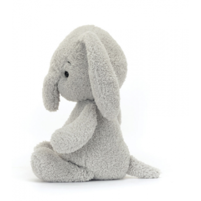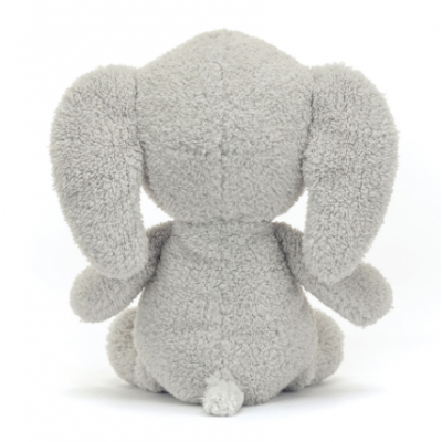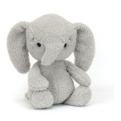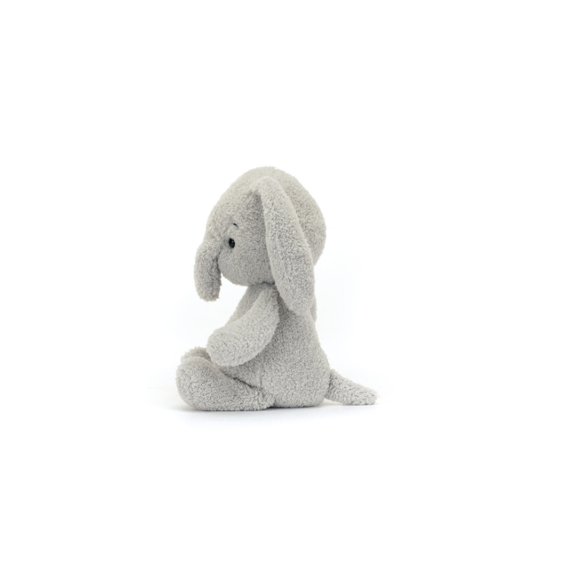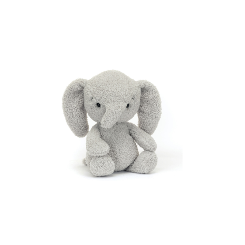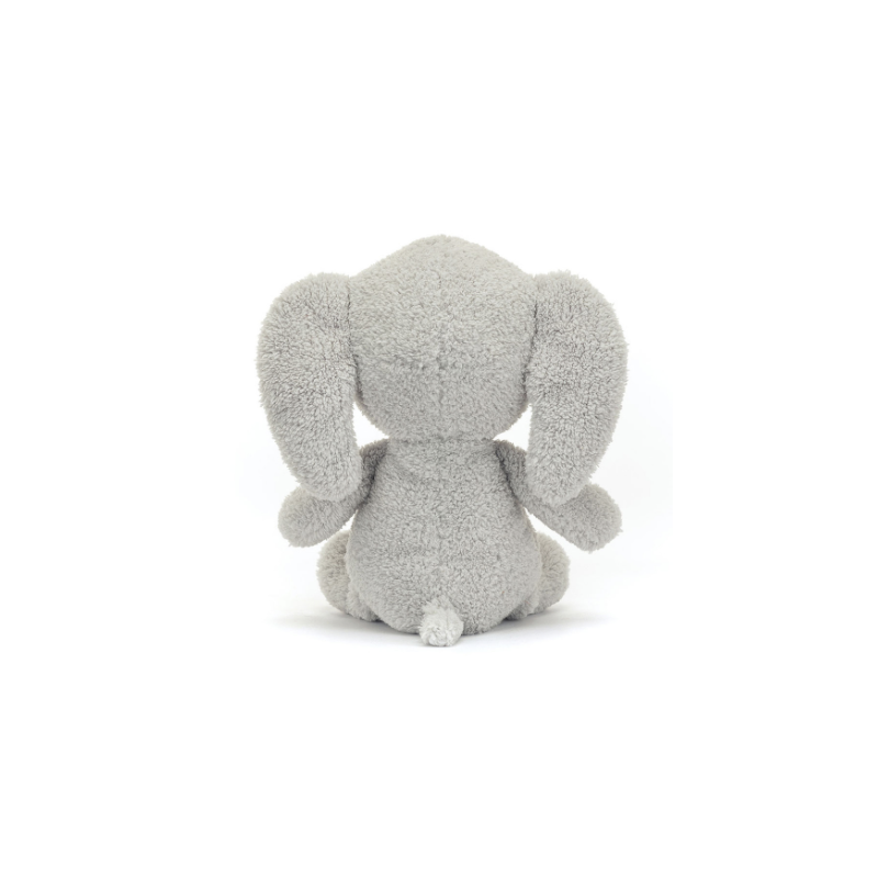 Elly le Roublard est un adorable éléphanteau à la fourrure grise courte et texturée. Sa tête douce et trapue et ses oreilles tombantes apaisent les petits voyageurs. Avec ses sourcils brodés, ses pattes en forme de haricot, sa jolie trompe tordue et ses yeux noirs brillants, ce bébé éléphanteau promet d'être immense.