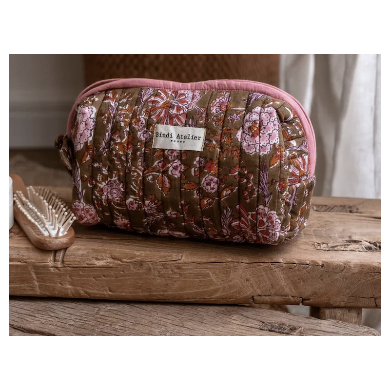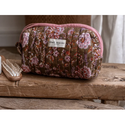 Trousses beauté imprimées à la main disponibles en deux formats: trousse maquillage et trousse de toilette.