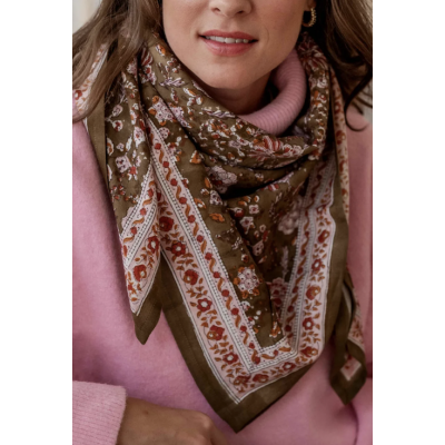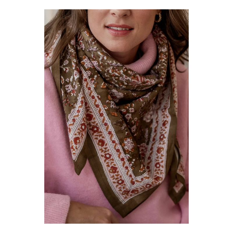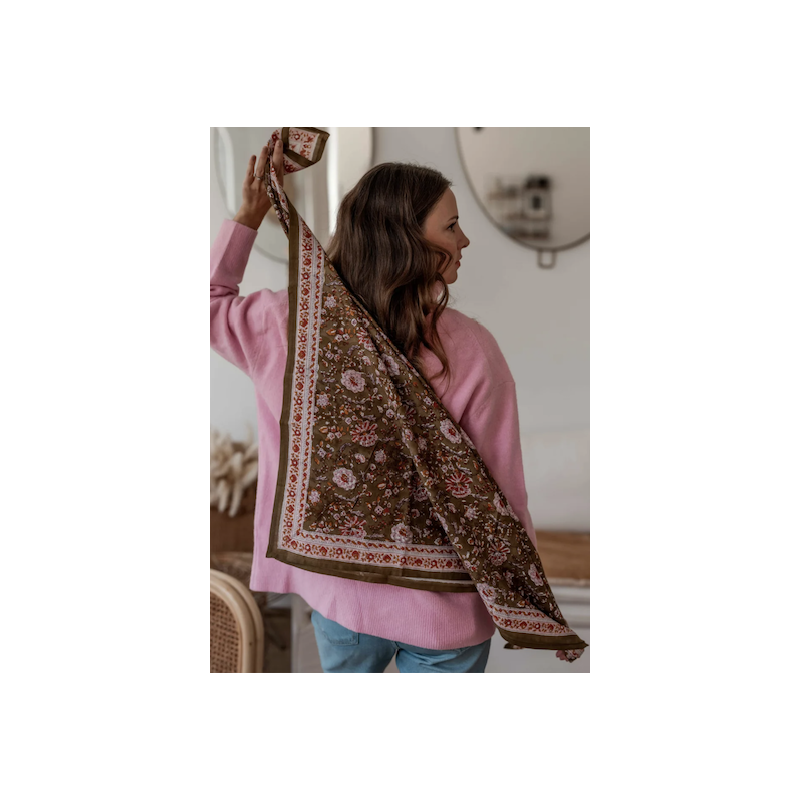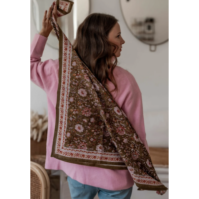 Un grand carré coloré et imprimé à la main sur un tissu doux au toucher peau de pêche qui enveloppera votre cou pour un look bohème, idéal à toute saison !