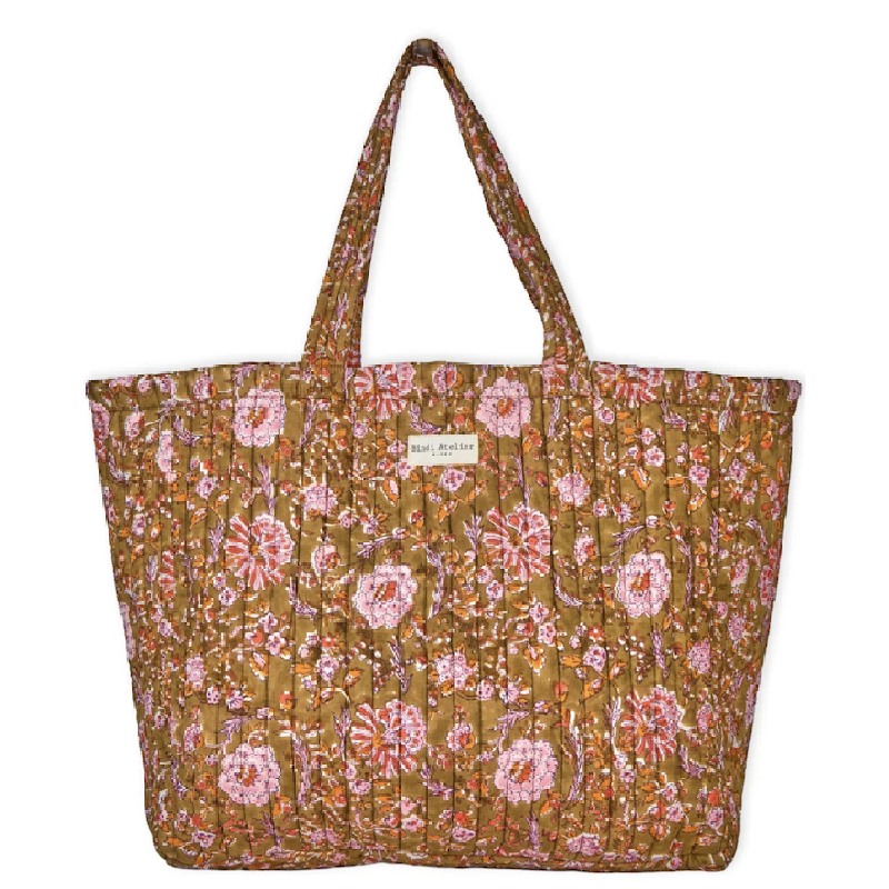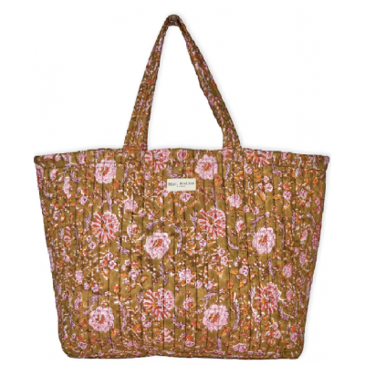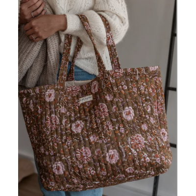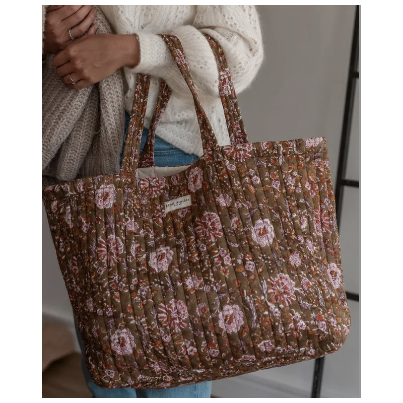 Ce sac cabas matelassé en coton, réalisé avec soin en Inde, est imprimé selon la technique du Blockprint, offrant un charme artisanal unique.