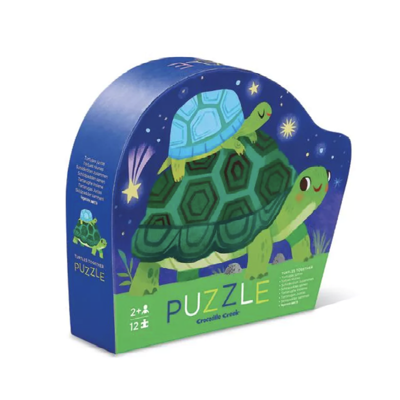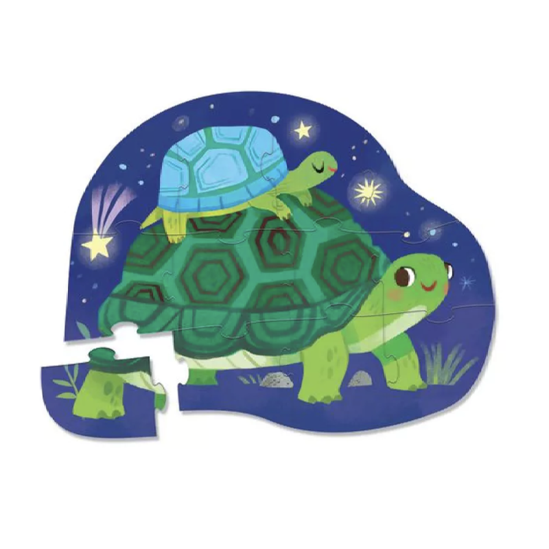 Un adorable mini puzzle de 12 pièces pour les enfants à partir de 2 ans, sur le thème des Tortues avec 70 % de matières recyclés mesurant une fois fini 22 cm x 30 cm.