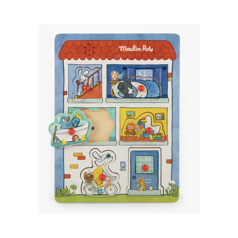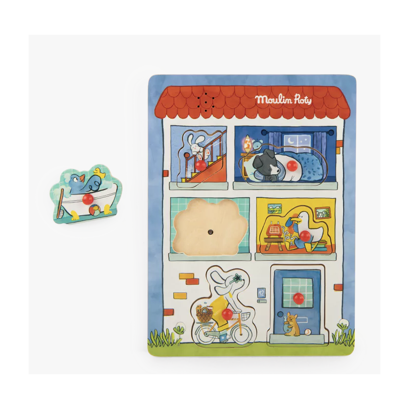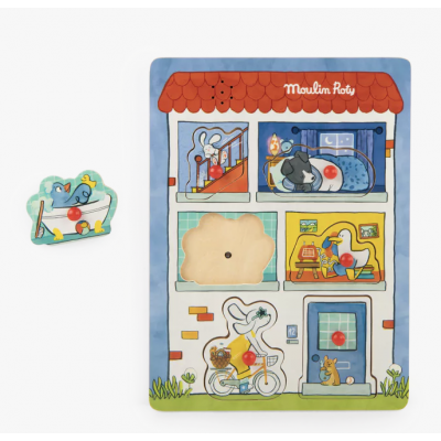 Puzzle sonore pour s'éveiller à la musique de manière ludique. Replace les 6 pièces en bois qui composent la maison de Puce & Pilou en y découvrant les sons du quotidien : sonnette, téléphone... Permet aussi d'appréhender les formes et les couleurs.