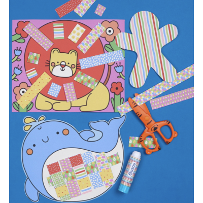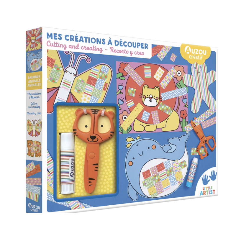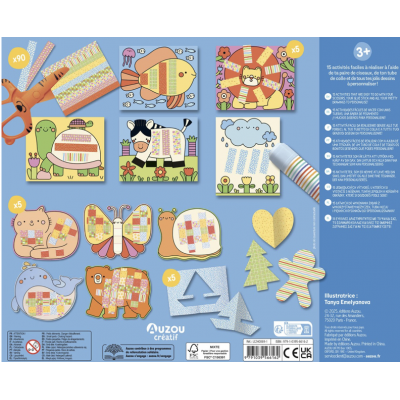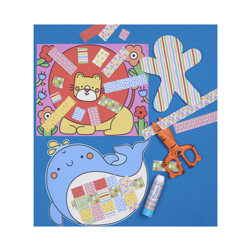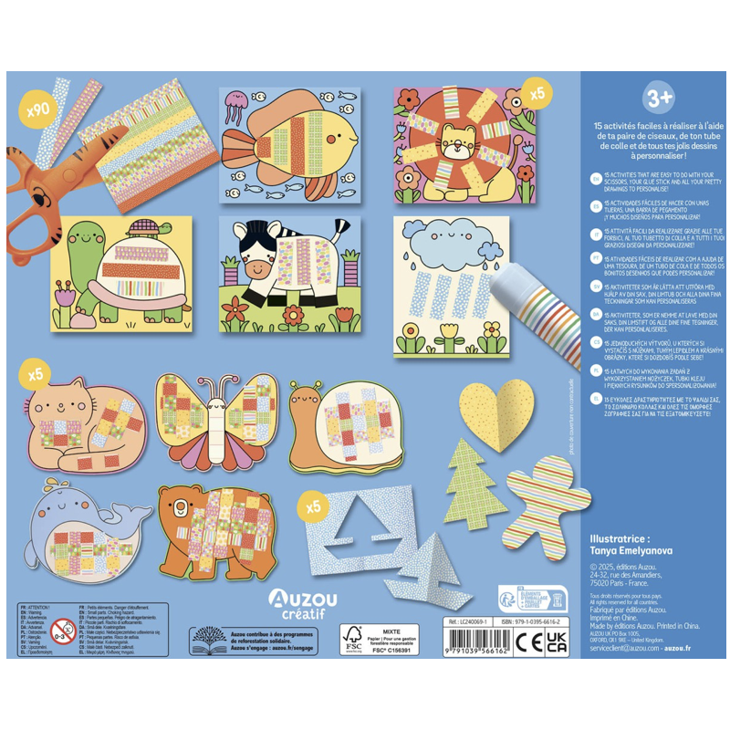 Un coffret contenant une paire de ciseaux, un tube de colle et 15 feuilles pour réaliser les activités suivantes : découpage, collage, pliage et tressage. Tout pour s'amuser et personnaliser d'adorables tableaux d'animaux !