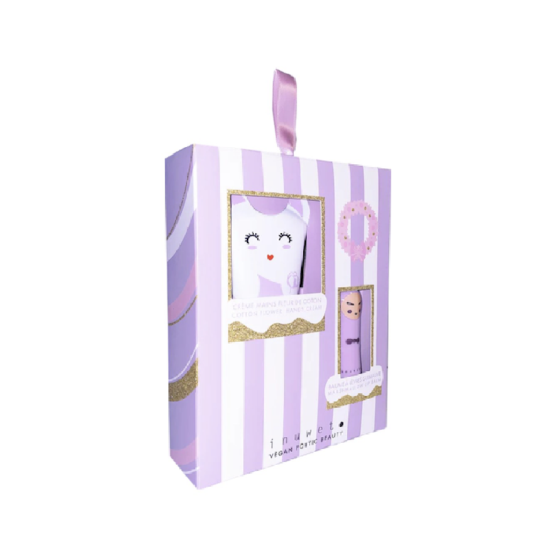 Ce coffret de couleur mauve et or est un coffret crème mains et baume à lèvres pour une routine beauté à tout moment :