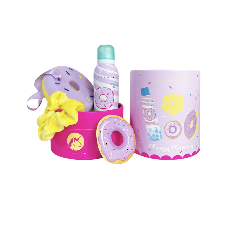 Une mousse de douche au délicieux parfum de donuts et 2 accessoires: une éponge en forme de donut et un chouchou accompagné d'un sticker donut.