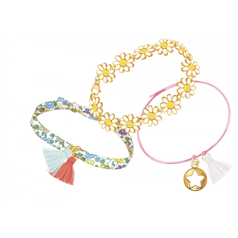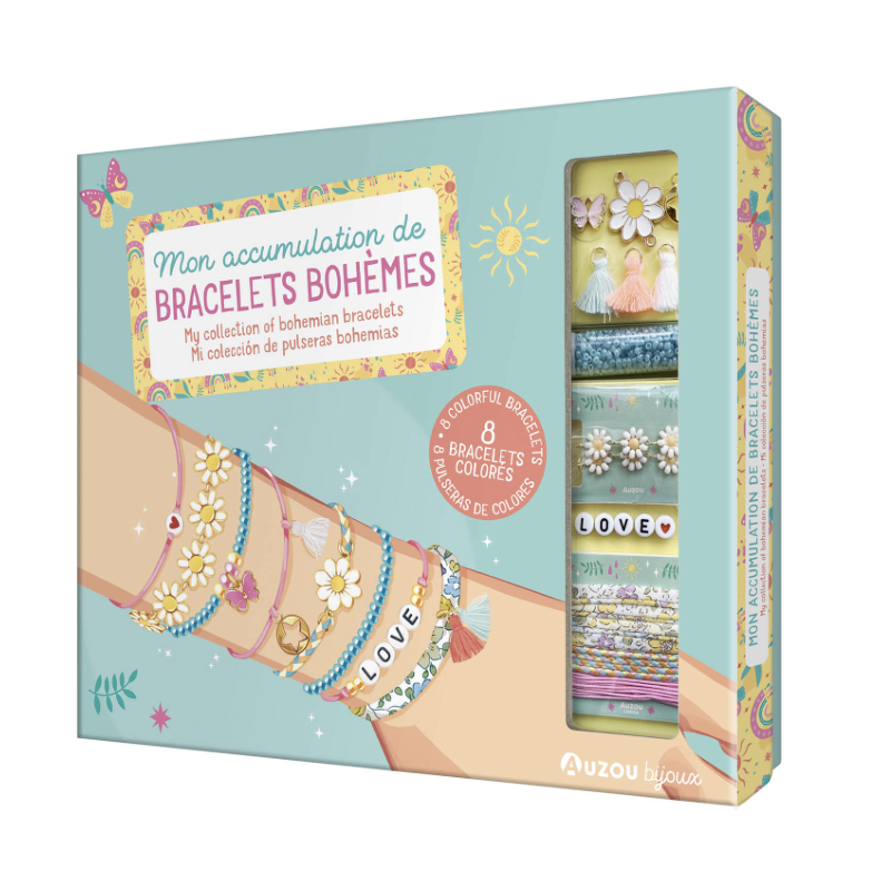 Des charms fleur, étoile, papillon, des pompons, du Liberty, des jolies perles de rocailles... Réalise 8 magnifiques bracelets bohèmes aux couleurs douces et fraîches !