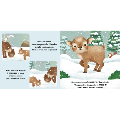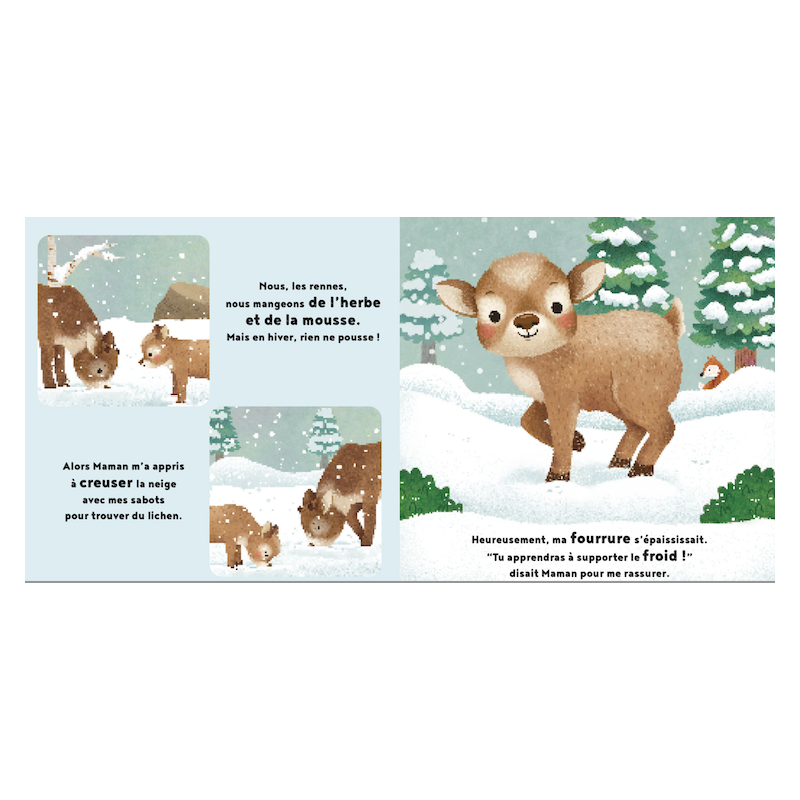 Je suis née dans le Grand Nord, un matin de printemps. Un doux soleil faisait scintiller la nature tout autour de moi… Au printemps, des milliers de rennes rejoignent leurs sites de pâturages dans la toundra. À l’automne, ils repartent dans l’autre sens pour aller s’abriter et se nourrir du lichen très riche de la taïga, la forêt boréale. Chaque année, ils effectuent ainsi deux migrations de plusieurs centaines de kilomètres, marchant à la queue leu leu dans la boue et dans la neige, suivis par les loups et les ours bruns… Une belle histoire pour découvrir le cycle de vie du petit renne.